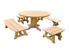 JUEGO DE MESA REDONDA 6´ C/4 BANCAS PINO CURADO, 70"LARGOX70"ANCHOX30.5"ALTO