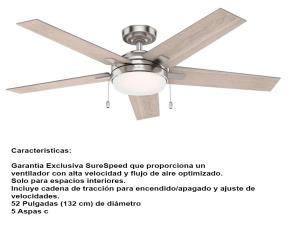 VENTILADOR DE TECHO DARLINGTON DE 52" CON 3 LAMPARAS 5 ASPAS ACABADO MATE P/INTERIOR
