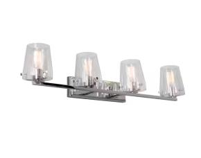 LAMPARA D/TOCADOR D/BAÑO INDUSTRIAL CROMADA C/4LUCES 33.75PULG C/PANTALLA D/VIDRIO TRANSPARENTE